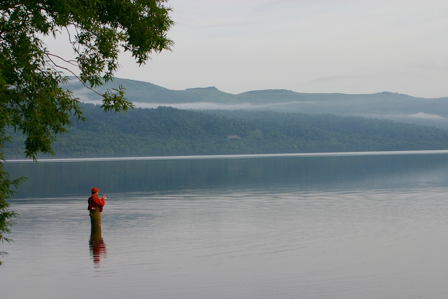 撮影日時:2004.09.07 06時07分。北海道 屈斜路湖畔 朝靄の中 湖上に立つ釣り人。1.27MB(1900x1267)Canon EOS KissDigital:レンズEF-5