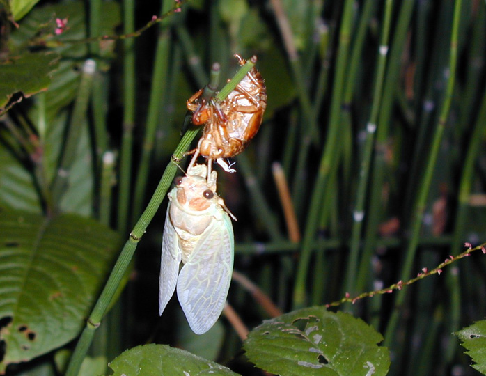 懐中電灯の光に浮かび上がった生まれたばかりの蝉。木賊にしがみついた抜け殻にぶら下がった、透き通るような体はひと夏の儚い命を思わせる・・翌朝にはどこかに飛び去っていた。(2005年8月、庭の片隅にて)