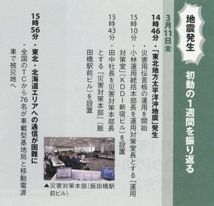 KDDIは地震発生後直ちに、「運用対策室」を新宿ビルに、「災害対策本部」を飯田橋駅前ビルに設置し、通信サービスの状況把握と復旧対策、お客様対応や情報公開等に指揮を執った。