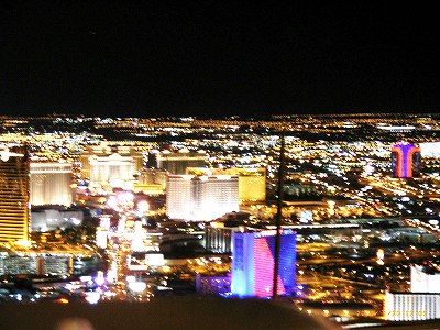 | ≪ナイトツアー≫ <ストラトスフィア塔> 夜の7時にホテルを出発する、「イルミネーション・ナイト・ツアー」に参加した。短い滞在日時でラスベガスを知るには、こうしたツアーを最大限に利用するのが賢明である。大きなバスが日本人のいるホテルを順次回って客を拾っていく。日本人の少ない時期ではあるが、それでも12〜13名は集まったようだ。まず、ホテルの立ち並ぶメイン大通り(ストリップ大通りと言う)の北限近くに立つ「ストラトスフィア塔(塔の最先端まで1149フィート)」に登る。 てっ辺までの途中832フィートのところに展望台があり、其の天井部分に、絶叫マシンが備えられている。今は3つあって、一つは、エクスクリームと言う巨大シーソー台である。地上にあれば何の変哲もないだろうが、人間が乗る部分が展望台の縁から外にはみ出すところが味噌で、高さ866フィートの上空に全身がさらされるわけで、発想がなんとも過激である。事故や故障になったらと思うとぞっとした。次ぎが、ビッグショットという、高い塔の上からベンチが一挙に落ちるやつである。”大空への人間射出” と言うのがキャッチフレーズで、横浜の八景島にあるのと同じような物である。ただ在る場所が909フィートの高さにあるのが大違いである。聞くところによると人気がなくて何時も空いていると言っていた。最後はインサニティで、これは空中を回るブランコである。展望台の縁から外に突き出た柱に5つのゴンドラが吊り下がっていて、回りだすと遠心力で大きく外に振れる。どれもこれも、心臓の弱い人には薦められない乗り物で、私は心臓は弱くないけど、高度恐怖症なので止めた。 しかししかしである。展望台からの夜景は、誰にも文句の出ない正真正銘の100億ドルの夜景と言っても過言ではない。夜景というものはどこも美しい。私は日本でも有数の夜景美を誇る函館、神戸、横浜、勿論東京も見たし、ブラジルのリオ、香港、ニューヨーク、パリ、メキシコ、ブエノスアイレスなど、それぞれが自慢する夜景を随分と見た。しかし、甲乙をつけるとなると、何か基準が必要である。それは、やはり規模であろう。光の輝く密度と色合い、景観の広がる角度とか視界の距離などの優劣が大事である。だけど、このスラトスフィア塔の108階のエレベーターホールから一歩展望台に入った途端に、いままでの各地の記憶は一ぺんに消し去られてしまった。自分がいる塔の展望台が、宝石を散りばめたような光の絨毯の真ん中にいるので、360度全てが五色の輝きの海である。特にホテルの集中するストリップ通りは大粒の”色もの宝石”(ダイヤではない宝石)を並べたように輝いている。まばゆさに目を中空にそらすと、地上の光が強いので星が良く見えないが、24時間運用のマッキャラン国際空港に離着陸する飛行機の夜間ライトの光が、四方の空に流星のように飛んでいる。昼間は西の空に、遥かにシエラ・ネバダの山並みが連なっているのがよく見えるであろう。 <ダウンタウン> ストラトスフィア塔から更に北に行くと、ラスベガス発祥の地といわれる、ダウンタウン地区である。古い街だけに、老舗のカジノやホテルだけでなく、市役所や各種行政機関もここにあり、ラスベガス市の市政の中心になっているそうである。いうまでもなく、ラスベガス市を代表するもう一方の観光スポットでもあり、目抜き通りの「フリーモント・ストリート」の派手な夜景は有名である。洪水のようにネオンの光が溢れているので、、夜間でもフラッシュなしで写真が撮れる。この通りには、ホテル群のあるストリップ通りにはない露店が沢山ある。露店といっても丸い屋台でちゃんと屋根もついている立派な店である。アクセサリー屋、下着屋、CD屋、お菓子屋、電話機を売ってる店などもあるし、無人の店もある。フリーモント通りは天井全部が電飾アーケード(フリーモント・ストリート・エキスペリエンスと言っている) になっていて、夜8時になると、天井全体が1250万個の発光ダイオードを使ったスクリーンのようなものになり、優れた解像力を誇る電光絵が一斉に流れる。題材はカジノの街らしく、ルーレットとかトランプとかサイコロなどが多いが、様々な衣装を来た女の子も出てくる。映写時間は5分くらいであるが、上を見上げっぱなしなの首が痛くなってしまう。 ![]() 日本人相手のこの観光ツアーには、海苔のおにぎりに、おしんこうと日本茶がセットになった弁当がついている。おにぎりを食べながら、夜の観光バスは派手やかなホテルや通りを縫って走り、ショータイムに合わせて無料ショーを見せてくれたりして、3時間余り楽しませくれる。特別なスポットではバスを降りて見物するが、ラスベガスは街全体がネオンの海の中にあるので、バスの窓から眺めているだけで、世界でも1,2の華やかな夜景を眺めていることができる。 <無料で見られるショー> 陽が暮れてから見るものとしては、ベラージオ・ホテルの前