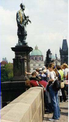 旅行者をプラハに惹きつける景観の一つに、夕日に映えるゴシック様式のカレル橋がある。その欄干には、左右15体ずつ合計30体の聖人像が立っている。この聖人像の中で最も有名で、いつも大勢の人が群がっているのが、聖ヤン・ネポムツキーのブロンズ像である。この台座に手を触れ、願いごとをすると叶うといわれる。ただし、その願いごとを他人に漏らすと、即、効力が消えてしまうのだとか。因みに、2003年8月、チェコを訪れた小泉総理も、「しばし、この台座に手を触れておられました」と、ガイドから聞いた。ヤン・ネポムツキーとは、14世紀の高僧で、ヴァーツラフ4世から、王妃の告戒の内容を聞かれ、それを拒否したために、拷問にかけられ、モルダウ川に投げ込まれたという人物である。この伝説には、諸説あるらしいが旅の途上、自分の願いごとを、人知れず唱えてみるというのも、夢があっていいように思う。