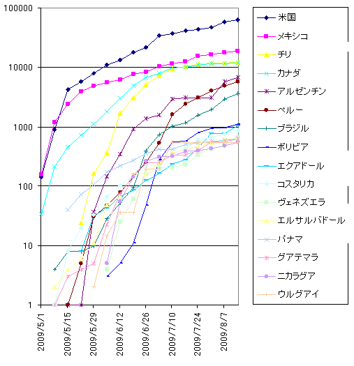 暑い暑いでこのところ一時的ではあるが、新型インフルエンザのことを忘れていた人は多いと思う。ところが、お盆が過ぎた先日の新聞に、遂に日本で死者がでたと報道されて以来、患者の発生が鰻上りの様相を呈している。北半球は真夏でも流行は収まらない。新型インフルエンザの恐ろしさが再び思い起こされ、秋以降の流行に神経が逆立つ思いである。元来、私は喉が弱く、歳を取るにつれて咳がつづき、痰がからむ。体にウイークポイントがあると感染しやすいと言われているので、秋までには十分対策を取らなければと思っている。掛かりつけ医は、早く罹りタミフルを飲んで3日間寝ていれば治ってしまう、早めに罹った方が軽くて済むと簡単に言っているが、果たしてどうなのだろうか。すでにマスクだけは夫婦で200枚を備蓄した。このくらいあれば間にあうと思っているのだが、やっぱり不安はおさまらない。 一方で真冬の南半球では、このインフルエンザ・ウイルスが猛威を振るっている。私に縁が深いアルゼンチンでも、感染者は8月15日には6768人に達し死者は338人に上り、さらに増加していると報道されている。この他の主なラテン・アメリカ諸国の最新の患者数は、メキシコ 18861(死者163)、チリ 12104(105)、ペルー 5743(45)、ブラジル 3642(338)、ボリビア 1111(14)、キューバ 264、パラグアイ 261(27)などとなっていてどこの国も右肩上がりである。8月15日現在の患者数は下図の通り。 ![]() 「今年はプレゼントは贈らないことにします。理由は、新型インフルが猛烈に流行し始めたので、貴家に、日本に、アルゼンチンのインフルエンザ・ウイルスが汚染するのを避けるためです」 という内容のものだ。思いもよらない内容である。ウイルスの寿命が幾日が知らないが、封筒にくっついて来たウイルスが日本で暴れだすことは十分に考えられる。彼らから来るアルゼンチンのプレゼントは、妻宛てのものが多いのだが、正直言ってここ数年、小さな袋物とか木製の彫り物とかで、すでに持っているものや日本人の好みには合いにくいものが多く、若干食傷気味であった。「まあ、そういうことなら別に送ってこなくてもいいじゃないか」 と妻と話し合っていたが、よく考えてみると、私達への心使いばかりでなく 、2万キロの道中の途中で接触する多くの人手や機材などへの感染までも心配していることが分かり、流石医者だねと、妻と大いに感心し、改めてその用心深さに敬服した。アルゼンチンの郵便事業は1990年代半ばに民営化されてからは綱紀も引き締まって信頼性も高まり、所要日数などもかなり短縮されてきた。EMS(國際スピード郵便)の封筒に入りさえすれば、干菓子や金平糖なども送れるようになった。されど、便利になった今だからこそ、「たかが封筒の一つくらい、つまらぬことを気にすることはない」、と笑ってはいけない。医者なればの発想ではあるが、送り相手への感染を防ぐことだけに気を使うのではなく、少しでも国外への感染を予防しようとする意識を持つ友人に心から敬意を表し、他山の石としたいと思ったものである。 (2009.8.20記)