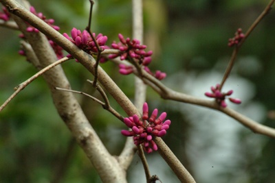 昨年の今頃は咲いていた福寿草が絶えてしまったのか、その気配すら無い。重いカメラを持ち出したのだからと、被写体を変えた。実が小刀の鞘に似ていることから学名に 「Cercis」 にがあるとの解説がある。ビールのつまみの枝豆にも同じような学名が付いているのだろうか? 左の写真に、昨年の名残の豆の鞘が3つ写っている。
