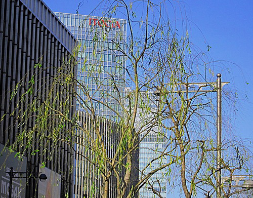いま、銀座の並木道には、柳の新芽が透過光を受けて優しく揺らいでいる。この時期、「踏青」という美しい季語があるが、野山に出ずとも銀座をそぞろ歩きするだけで自然の息吹が伝わってくるのは、嬉しいことだ。明治時代、銀座には政府の方針で、柳、桜、楓、松などの木が植えられたそうだが、水分の多い土地のせいで、生命力の強い柳だけが残ったのだとか。西條八十は、“巴里のマロニエ銀座の柳”と歌っているが、その柳も昭和期にくらべると、かなり少なくなっているらしい。 ( 写真と文:大谷恭子)