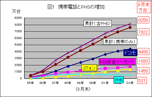 わが国の携帯電話は順調にその台数を伸ばしてきたが、普及率が60%を超え、需要の頭打ちが 取り沙汰されるようになった。電気通信事業者協会(TCA)が毎月発表している携帯電話契約数 のデータからその様相を推測してみた。