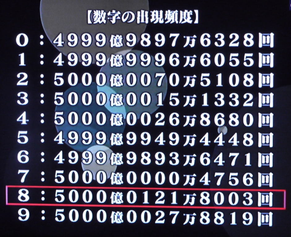 ところで、昨年8月、長野県飯田市にお住まいの近藤茂さんという会社員の方が、自作のパソコンでπを5兆桁まで計算し、ギネスに認定されるという、とんでもない快挙を成し遂げられました。使ったメモリーは24テラバイト。ハードディスクを16台使い、90日かけて算出したそうです。因みに5兆桁目の数字は「2」。5兆の数列に現れる数字の出現頻度はどれもほぼ同じで、それぞれ5000億回ほど。最も多く現れるのは「8」だとか。